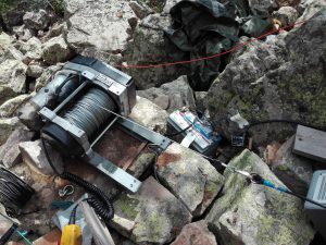 Le cable porteur a été mis en place, les points Sud, Est et Ouest ont été équipés de leur armoire électrique, alimentée par panneau solaire, et de leur antenne WiFi. Le treuil de manoeuvre du cable porteur a été remis en service. Le site dispose d’une communication satellite (internet et téléphone).