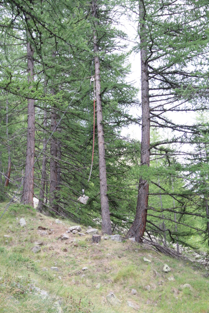 Vue d’ensemble. En agrandissant l’image on voit bien la cordelette de rappel (jaune), qui écarte le contrepoids du tronc du mélèze