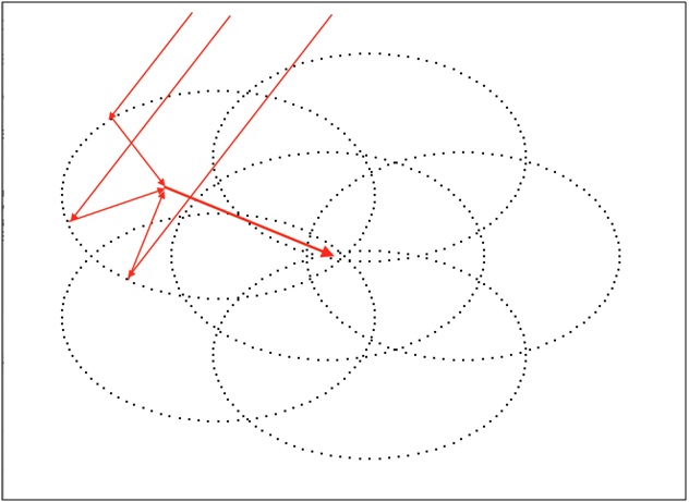 Figure 2.A Plan view of mobile M1 mirrors carried on flat ground by legged robotic rovers. They can be distributed along an ellipse, deformable about one of its foci, for reflecting beams from an observed star toward it, while maintaining their coherence. The ellipse is the intersection of the flat ground with a paraboloïd aiming the star and confocal with said ellipse, thus ensuring equal optical paths from the star to the focus. A hierarchy of ellipses can be used.