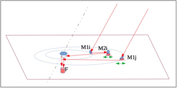 Figure 2.B Primary mirror elements M1i can be kept fixed, at arbitrary positions, but with tip-tilt actuators, if they feed as many facing mirrors M2i, radially movable for serving as delay line elements. The M1 mirrors located at the outer edge, such as M1j, require no delay line if they are mobile.